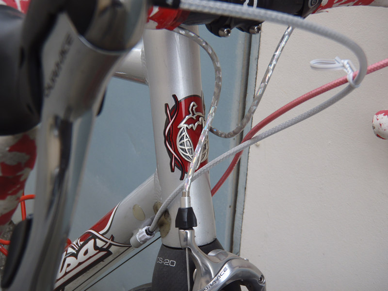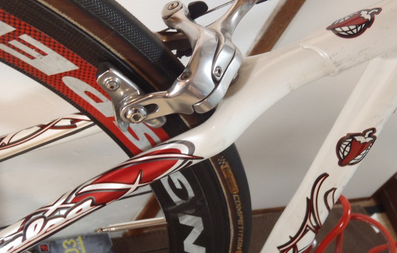 急加速やダンシングのパワーを(オレは非力だが)スムーズに推進力に換えてくれる感じはある。ただし、最近のロードバイクのトレンドからするとちょっと重いんだろうね。輸入元のサイトによると、1.35kg(フレーム)+408g(フォーク)ということだ。最近、フレームだけで1kgを切るものが多いので(Look 595はフレーム1080g、フォーク込み1.4kg。Scott