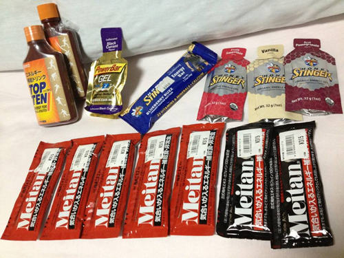 今回の補給食。トップテンはボトル半分はハイドレーションへ。あとはダイレクトに。メイタンは善良消費、それ以外の上の5つは使わず持ち帰ったね。ハニースティンガーも、うまい。少し、過剰摂取だったかな?と思いながらも問題なく。