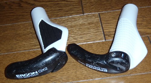 Ergon Grip GX2 Carbon/GR2-L MagnesiumErgonについては、使用は2セット目だ。こういうタイプのグリップはいくつかあると思うが、先端のバーエンドバーの座りがいい。こやつ、ノーマルタイプだとこのエンドバーが、異様に重い。わざとですか?というくらいだ。ずっしりと、その重さを感じることが出来る。ただでさえ、グリップそのものが大きいので重いのに。 下から2番目?のタイプになると、このさきっちょ部分がマグネシウムになる。それでも、ずしっとくる。とうとう、カーボンにまで手を出してしまった。これなら、まあ我慢出来る範囲。市販の3D Forgedのアルミバーと、普通のグリップにした方が圧倒的に軽いのは間違いない。 でも、手の座りがいいので、つい2台のMTBにこれらを装備。感触は良好だ。セッティングは、当然単なる丸いものよりも慎重に、複数回にわたって状況を見る必要がある。通常のクロカンなら不要と思うが、延々と下ったりするときに一助になるかも。オレは助けられている。 重量ともう一つ弱点。マグネシウムもカーボンも、汗、水分、ジェルなどで、とってもよく滑る。わざとですか?というくらいだ。塗装や表面加工でなんとかならんの? あ、カーボンのバージョンは高い!ノーマル3k、マグネ5k、カーボン10kってところ? 最後にまじめに。GX2は、ややこぶり。ハイスピードでシビアなときはこれくらいがよいかも。GR-2はぐにっと柔らかく、長距離ではよいのかも。エンドバーのそれぞれの互換性は...調べてません。 →微妙にサイズが違い、GR2-LとGX2はさきっちょの互換性なし。 |