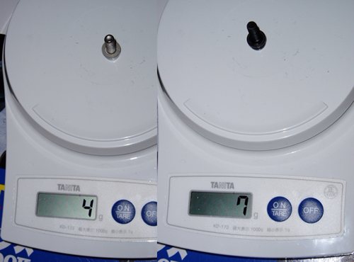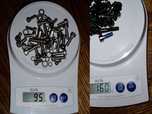 通販で買ったチタンボルトフルチタン、ではなくチタンとアルミ合金と思われるが、散財ついでに買ってみた。1本あたりは見ての通り。多分M4のどこそこのボルト。たかが3gの差。しかし。 この時、スカルペルに使われている多くのボルトを徹底的に換えまくった。シマノ製品に使われている部分が多い。ご丁寧に、ワッシャーもチタン。もしも、と思いブレーキキャリパーとシートポストへの採用は見送ったが、最終的にはキャリパーにも採用、あれから6年経過するが全く問題ない。酸化による固着やら、折損やら考えたが、発生しなかった。 何はともあれ、取り外したボルトをまとめて持ってみると、ずっしりと重い。これだけ、体感として差があるのか。バカに出来ん。 自己責任でお試しあれ。 |