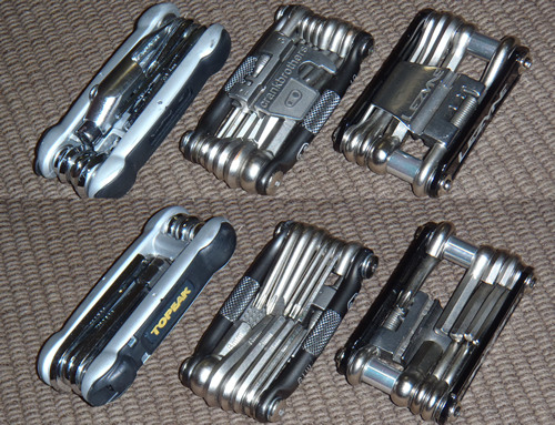 携帯ツール地味ながら、携帯ツールを選ぶというのは難しい。右のImage、左から... Topeak。ブランドとしては圧倒的に安心感あり。全般的に見た目、携帯性、使用感と良好だが、Imageではわかりにくいがチェーンカッターはアレンキーを挿入する形。で、左右の黒い部分を外すと、そのサイズのアレンキーが顔を出す。...が!そのアレンキーまたは6角穴、たった一度のチェーンコネクティングのテストでなめてしまった。なめてんのか!あの、いや、なめてます。ということで、チェーンカッター以外はそのサイズから、非常によい。 6mmか5mmに8mmのカバーをかぶせているが、ペダルにも使える。 クランクブラザーズ。ペダルに使える8mmからずらりと揃う。チェンカッターの動きも申し分ない。通常のリムのニップルも回せるばかりか、むりやりMavicのそれも回せるということになっている(これはさすがに使ったことがない)。 バリエーションが多いのはいいが、大きく重い。ただ、オレは実績から、これを王滝に連れて行った。 レザイン。新進気鋭のアメリカンブランド。これも8mmからずらりと揃うが、どちらかというと必要最小限という見方が出来る。クランクブラザーズより軽量で、キーの数は少ないが、突き詰めるとこのあたりになる?なんとかチェーンコネクティングピンも折ることは出来る。 ロードにはTopeak、MTBのツーリングにはレザイン、タフな環境にはクランクブラザーズか(この中ならね)。