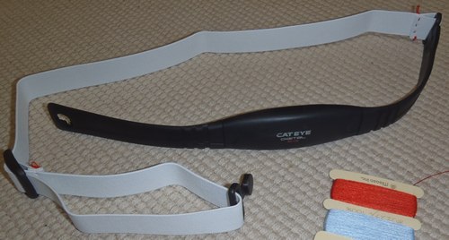 Cateye V3c CC-TR300TWオレは、このV3Cを3個使っている。設定を変えて、1個or2個で使えばいいのに...。ま、よい。1個は不具合品みたいで文字崩れが起きたりと大変だ。通販で買ったので、めんどいのでこのまま使用中。 さてV3Cはいくつかネックがある。そのなかで寒気があたると心拍が240くらいになったりするとか、色々あるが、3年程度?で、心拍センサーのゴムがびよんびよんになってしまうことだ。3年も使えば十分元はとってますね。 上のImage。わざとやってるくらいびよんびよんだが、わざとではない。のびきって、こんなふうになってしまう。そこで見つけたのが、オレが愛するローソン100で発見した、幅20mmの換えゴム。ためしに付けてみると...おおっ!(下図) すばらしい。 あまりにもぴったり。 ただ、男が一人、アパートでゴムを相手に裁縫をしているのはあまり美しい姿ではない。 ちなみに、もちろんゴム部分、純正で売ってます。800円くらい。 |