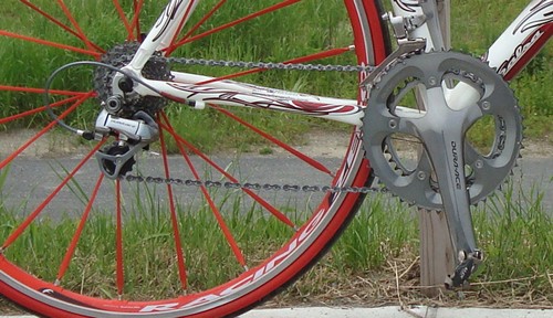 | Salsa Campeonは、コンポーネントについて当初DuraAce78シリーズで全て纏めた。理由は...特にない。どうせなら行っちゃえ、ってだけ。実力的にはそんなもの全くもって不要で、堅実に105シリーズでそろえるのが正義ではないか。でも、なんだか見た目がいいなあ...ってわけで。 細かくは、ブラケットがオレの手にはでかい。シフトの為の手の動きが大きい。これらは79で改良されているようなので、将来的には移行だね。 問題は、クランクだ。78シリーズのクランクは、でかいギヤしかない。結果、52,39が一番小さいので、こいつを購入。一般の峠やロングライド、鈴鹿サーキットでは問題ないが、ヒルクライムレース、さらに富士スピードウェイのあの峠(と思っているのはオレだけ)。FSW、結果毎回インナーローまで使ってひぃひぃ登っている。明らかに脚力がないオレにはありえない。 結果、「コンパクトクランク」とやらが欲しくなった。10年の春だっただろうか。アルテグラSLに照準を定めた...が、勢い余って79のクランクでコンパクトなヤツ、7950を購入。そもそも、互換性がないよ、といわれている組み合わせだ。スペックを見ると、従来比で確かにギヤ間が数ミリ離れているようだ。まー、いいや。BBに入るんだから付けちゃえ。 付けてみた。フロントディレイラーを、アウター50にあわせてぐぐっと下げる。チェーンは切ったほうがよさそうだが、とりあえずテンションボルト調整をしてみる。ん?その他、全く調整しなかったが、何の問題もなく、いや、音もなく変速するぞ。今までよりよくね? |