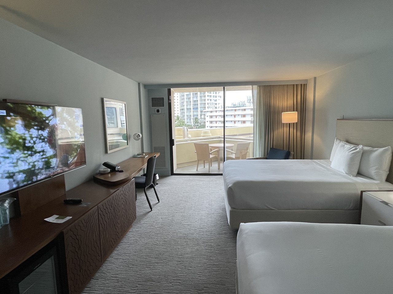 さてホテルだ。他に泊っていても、ファーマーズマーケットなどがあるので立ち寄ることが多いと思われるハイアットリージェンシーワイキキ。うちの妻子は前回もここに泊まっていたらしい。安いツアーということもあって、部屋の指定はしていないので、最下層。それでもまあオレは満足したなあ。お金を掛けられるなら、海沿いのホテル、またはシェラトンの上階層海側ってのが美しい形かな、とも思った。