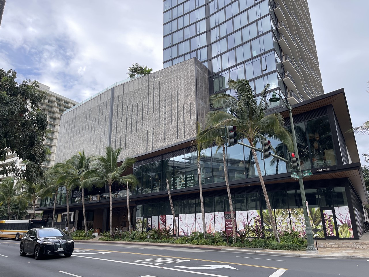 今回はどうすっか。もともと、ワイキキトロリーのピンクラインを、JCBカードを使って乗ろうと思っていた。が、当然多くの観光客もいるし、加えてJCBカードユーザならただ乗り出来るので、結構混む。見ると、えっらい行列だったり。そこで今回浮上したのはANAトロリーだ。この画像は乗り場ね。DFSの一番奥、駐車場+車寄せにある。カフェの横に入口があるよ。