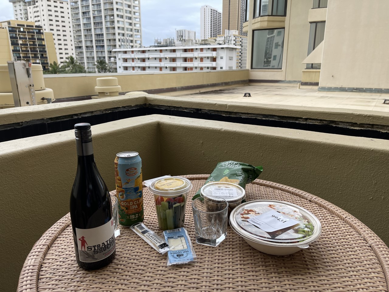 ホテルに戻ったが、順当に行くとチーズケーキファクトリーあたりで夕食ってところ。だがホテルの環境も活かしたいので、ベランダ飲みをすることに。船橋のアパート以来だな(違)。近所に新しいスーパーマーケットがあるらしいのでそこに行ってみる。