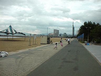これが百道のImage。左側は砂浜です。で,少し右にある赤銅色の丸いのが福岡ドーム。さらに右の高いのが福岡タワーです。さらに右手にはハイテクな感じのマンションが建ち並び,ドームの近くはこれまたハイテクな企業が(日立,NEC,富士通,あとはどこだっけ)自社ビルをどさっと建ててます。
