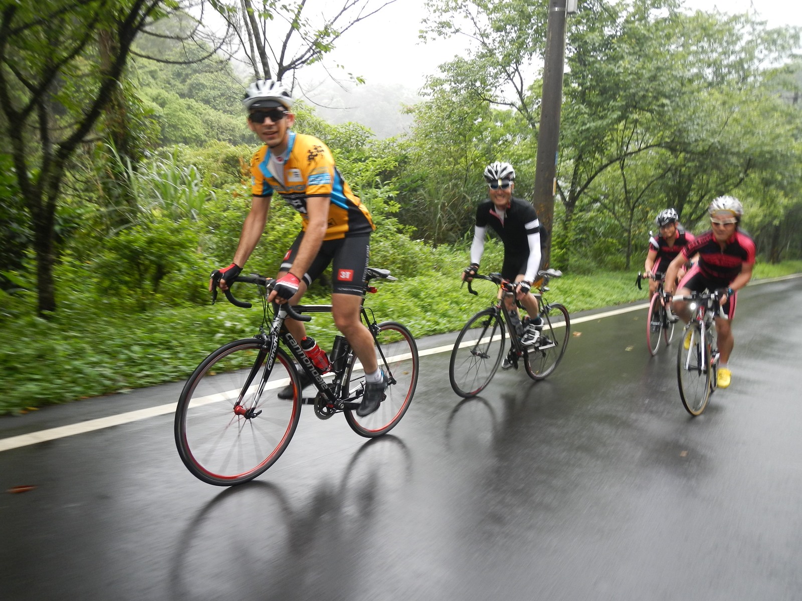 ということで、細かなアップダウンを乗り越え、景色を眺め、また激しい雨も降ったが木の下で雨宿りをし、濃密な空気を吸い、充実した、濃密なサイクリングを楽しんだ。画像をご覧あれ。でも、すごく覚えてるんだけど、「新城」に下りる最後の下り坂、みんながすっとばして行くんだけど腰が痛くて全然走れなかったなあ。みんなを待たせちゃったもんね。