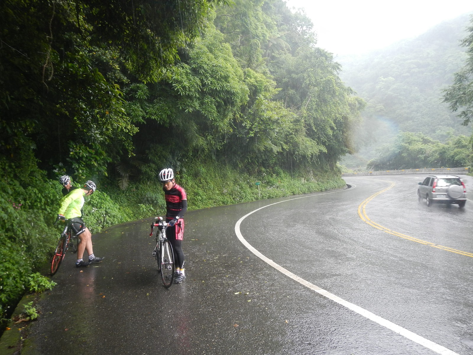 こんな感じだ。メンバーには安全第一、気を引き締めよ、危ないと感じたら車でワープしよう、と話した。宜蘭の30km以上の平地から、ついに上り坂に差し掛かる。地形を見ると、九州の熊本-鹿児島の海沿いのルートを走るような感じで三角州がぽつぽつとあり、先に書いたようにそこに小さな村落が形成されている。そういう街には必ずセブンイレブンとファミマが並んでいるので、そういうお店を目標に走る。ちょうどそういう村落は、2時間走ったら出現するような感じ。旅行会社の方とも次はここ、次はここ、という感じで打合せながら駒を進める。