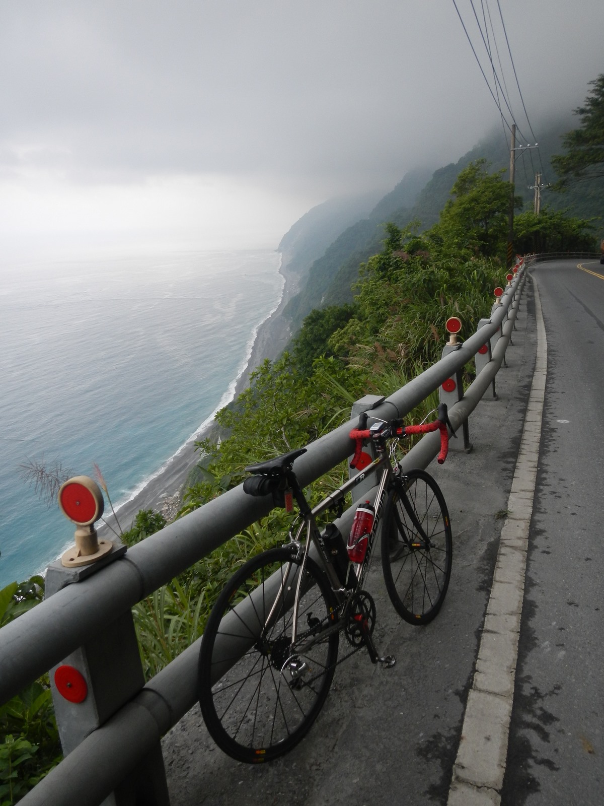 最初の台北からの峠を越え、道路をスマートフォンの地図と、あらかじめGarminに入れておいたデータで確認しながら進んでいく。過去、仕事/旅行で台北、台中、高雄という西側は経験があったが、台湾東側は初めてだ。台湾は、なんとなく九州に似ていて、しばらく何もない道を走ると、時々村落が現れ、そこにコンビニがあったりする。こういうところを中心に補給した。普通のお店でもよかったけど時間を稼ぐためだ。旅行会社の人にアテンドをお願いするてもあったけどね。車はみんな高速道路を通るだろうからか、ほとんど車はいない。景色をバックに記念撮影など。