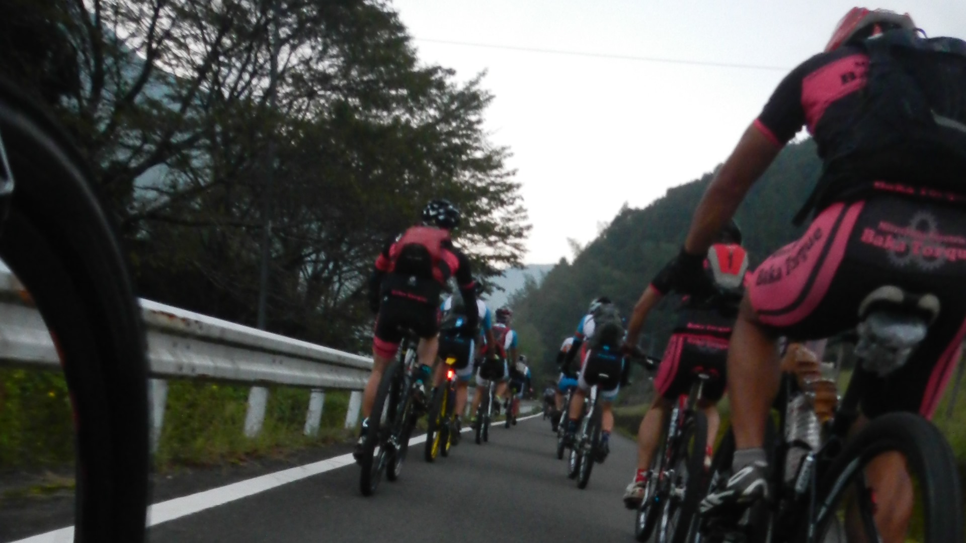 6時、いよいよスタート。王滝と同じ、ぷわぁ~んという音でスタート。これでなきゃ!前方に位置した走れる方々は一気に飛び出した様子だが、我々及び近隣の皆さんはサイクリングペースで進み出す。小学校を出て少し走ると、物凄く遠くに先頭集団が見える。最初はアスファルトを延々と上る。その間、後ろから上がってくるチーム、また前方から落ちてくるチーム。その途中、凄く風光明媚な場所を通る。高級なホテルがあるエリアだ。これはよいね。