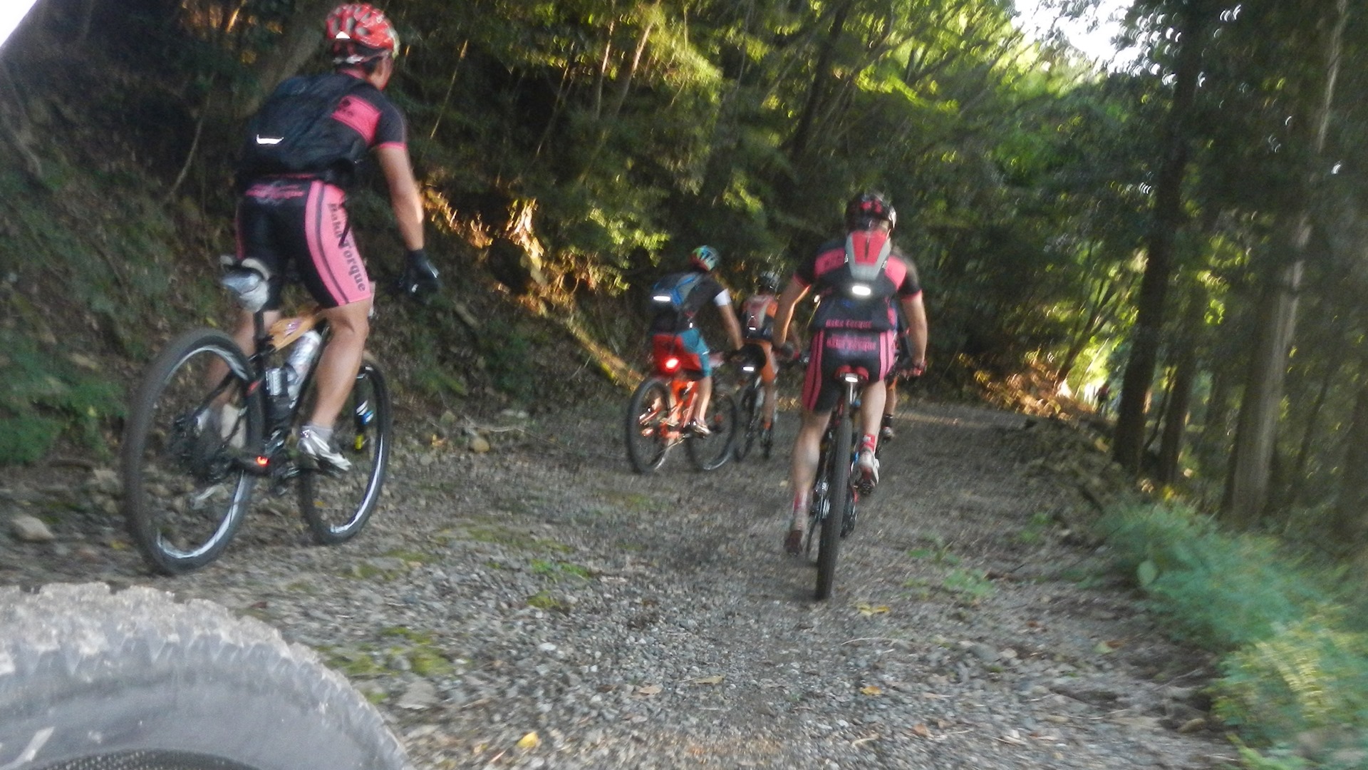 リタイヤを決めた方々は、正解だ。 その人達を羨ましいと思いながら、まだメンバー4人は問題ないので、当然走り出す。スタートした時と同じ道をしばらく走り、かなり上ったところを左折、最後のトレイルへ。大して急でも難しくも無い道なのだが、疲労の蓄積があり、さすがの我々4人もペースがばらつく。何故か元気になるのはSさん。わずか10日前に行われた大雨の王滝では、滝の様な雨の中シングルスピードで走り、何故か過去最高のタイムを叩き出すという変態度を見せつけてくれた。逆境に強い?