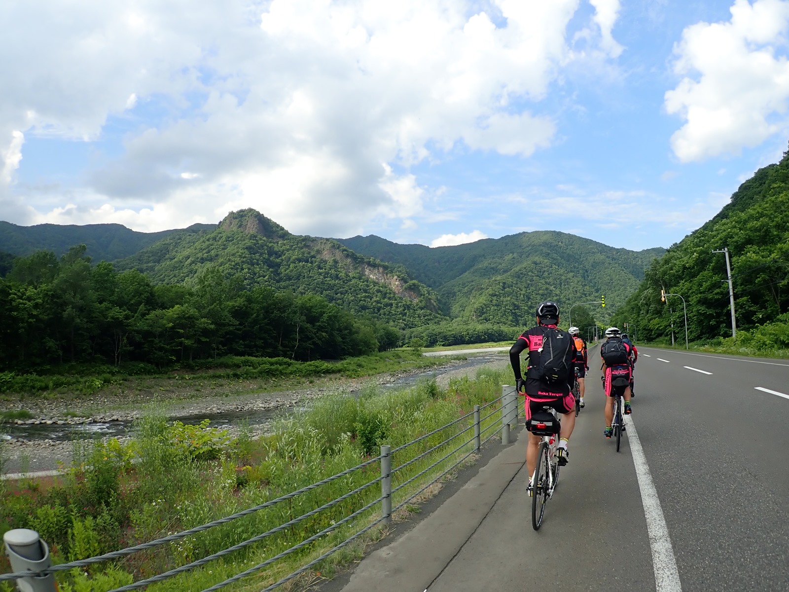 ここは店の前に駅があり、そこにトイレもある。ここを超えると、ずーっと日勝峠に向かって上り基調になるので、ちょっとだけ気合を入れていく。といっても、大きな峠は2つだけ。あとは2-3%の上りが延々と続く感じかな。北海道の道は悪い。よく、自転車雑誌で路面が荒れている、という話が出てくるが、本州の路面はそれでもきれいだと思う。が、北海道はそうはいかない。