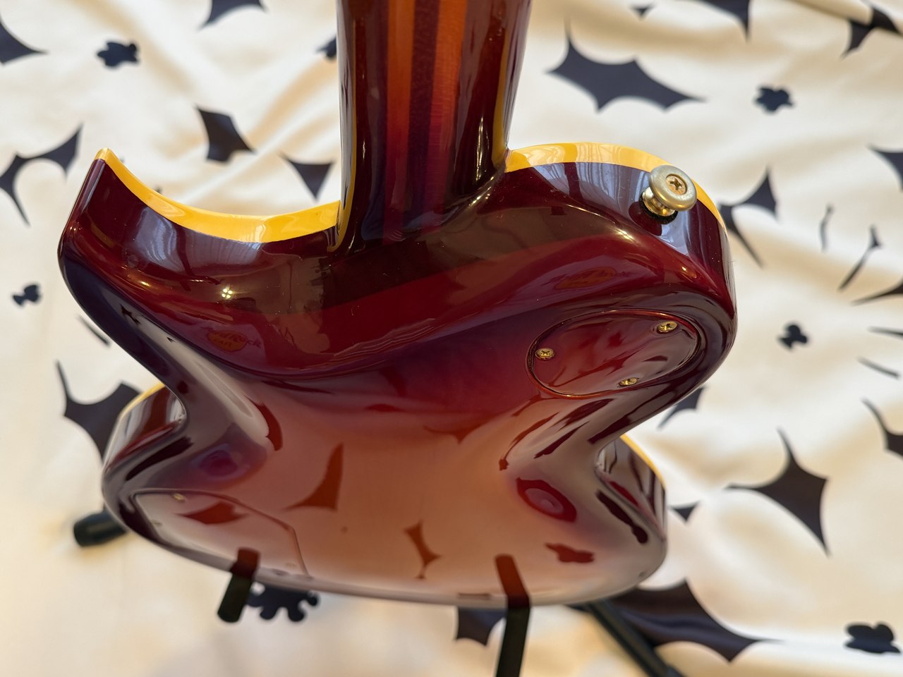 ある日ぱらっとヤフオクを見ていたら、4万くらいの現在価格でこれを見つけた。「ジャンク」の表示なので、格安スタートだったみたい。音が出るかどうかは怪しい。傷やネックの状態も画像での確認には限界がある。同じようなものは、たまたま14万くらいで出ている。うーん、はずれでもいいや、11万までなら出そう。ってことで、ぽいっと11万で入札してあとは放置プレイ。